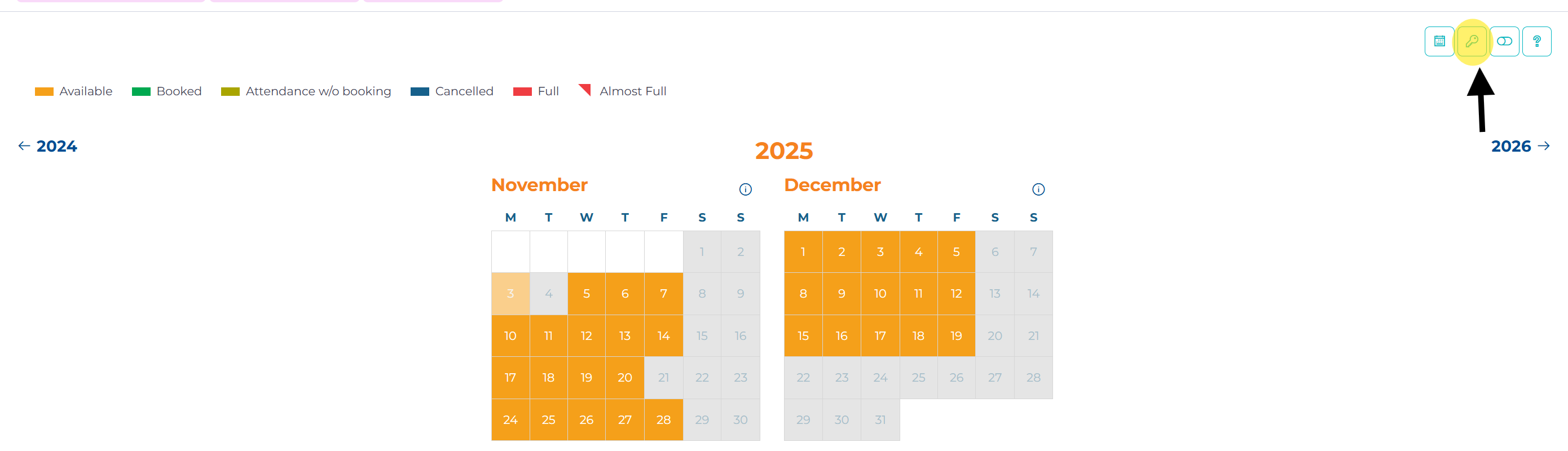 To see the key on your booking screen, click on the key symbol to the right of the calendar.